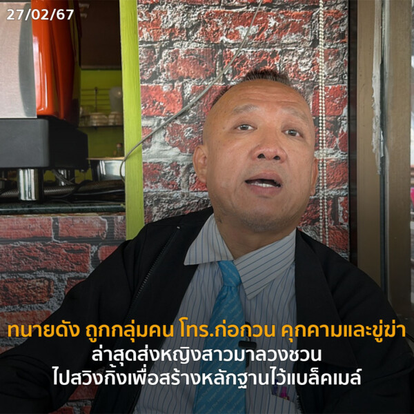 ทนายดัง ถูกกลุ่มคน โทร.ก่อกวน คุกคามและขู่ฆ่า ล่าสุดส่งหญิงสาวมาลวงชวนไปสวิงกิ้งเพื่อสร้างหลักฐานไว้แบล็คเมล์