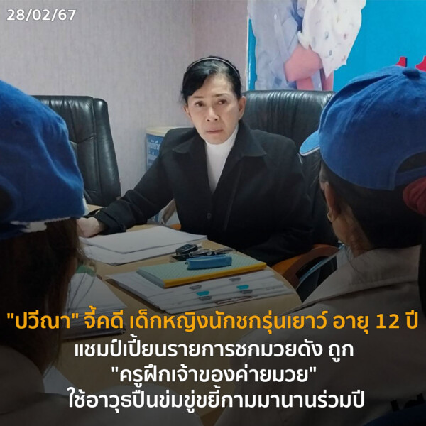 “ปวีณา” จี้คดี เด็กหญิงนักชกรุ่นเยาว์ อายุ 12 ปี 2 คน แชมป์เปี้ยนรายการชกมวยดัง ถูก “ครูฝึกเจ้าของค่ายมวย” ใช้อาวุธปืนข่มขู่ขยี้กามมานานร่วมปี ลั่น! จะยิงทิ้งถ้าไปบอกใคร เด็กกลัวตายและกลัวไม่ได้ชกมวยอีกจึงเก็บเป็นความลับ เครียดจัดถึงขั้นอยากฆ่าตัวตาย ยาย ร้อง ปวีณา ให้เร่งคดีจับกุมเจ้าของค่ายมวย เด็กเรียกร้องขอให้ติดคุกตลอดชีวิต และยังมีเด็กหญิงอีกหลายคนทั้งที่อยู่ในค่ายและเลิกฝึกชกมวยไปแล้วถูกข่มขืนด้วยแต่ไม่กล้าแจ้งความ วันนี้ ปวีณา เดินทางไปประชุมกับ พ.ต.อ.พิเชษฐ์พงศ์ แจ้งค้ายคม ผกก. สภ.เมืองสมุทรสาคร เร่งให้พนักงานสอบสวนรวบรวมพยานหลักฐานออกหมายจับ และจับกุมครูฝึกมวยหื่นรายนี้มาดำเนินคดีโดยเร็ว ถือเป็นภัยร้ายแรงของเด็กและเยาวชน