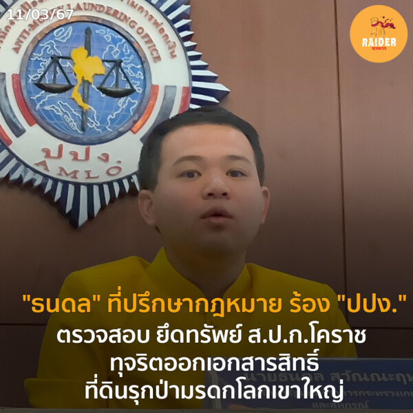 “ธนดล” ที่ปรึกษากฎหมาย ร้อง “ปปง.” ตรวจสอบ ยึดทรัพย์ ส.ป.ก.โคราช ทุจริตออกเอกสารสิทธิ์ที่ดินรุกป่ามรดกโลกเขาใหญ่