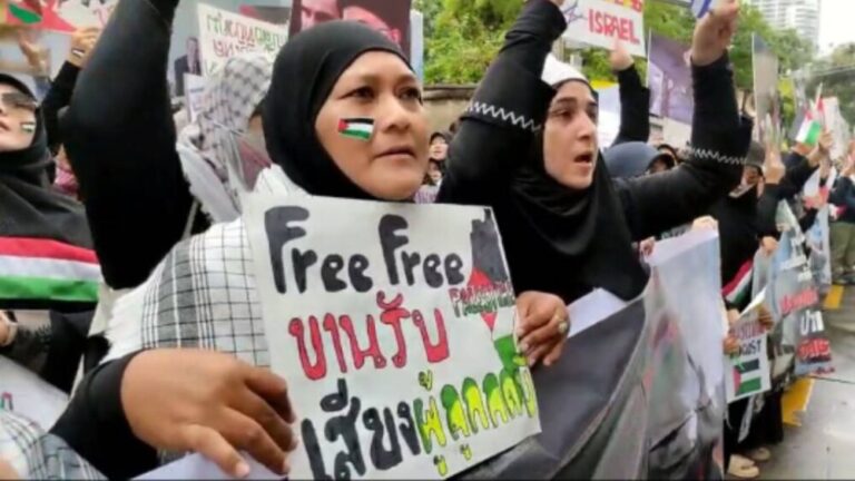 วันที่ 21 ต.ค.66 ผู้สื่อข่าวรายงานว่า ที่โอเชี่ยล ทาวน์เวอร์ ซอยวัฒนา แขวงคลองเตยเหนือ เขตวัฒนา กรุงเทพฯ ประชาชนชาวปาเลสไตน์ และสมาพันธ์คณะกรรมการอิสลามประจำ 5 จังหวัดชายแดนภาคใต้ ร่วมกันชุมนุมเชิงสัญลักษณ์ประมาณกว่า 300 คน หน้าสถานทูตอิสราเอล เพื่อประท้วงการเหยียดเชื้อชาติพันธ์ และเรียกร้องให้หยุดการฆ่าล้างเผ่าพันธ์ในกาซ่า