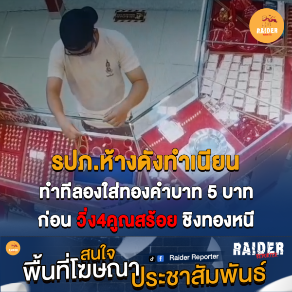 รปภ.ห้างดังทำเนียน ทำทีลองใส่ทองคำบาท 5 บาท ก่อนวิ่ง4คูณสร้อยชิงทองหนี ใช้สก๊อตเทปปิดทะเบียนรถ