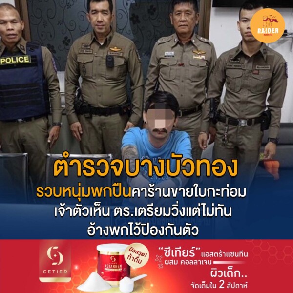 ตำรวจบางบัวทอง รวบหนุ่มพกปืนคาร้านขายใบกะท่อม เจ้าตัวเห็น ตร.เตรียมวิ่งแต่ไม่ทัน อ้างพกไว้ปิองกันตัว