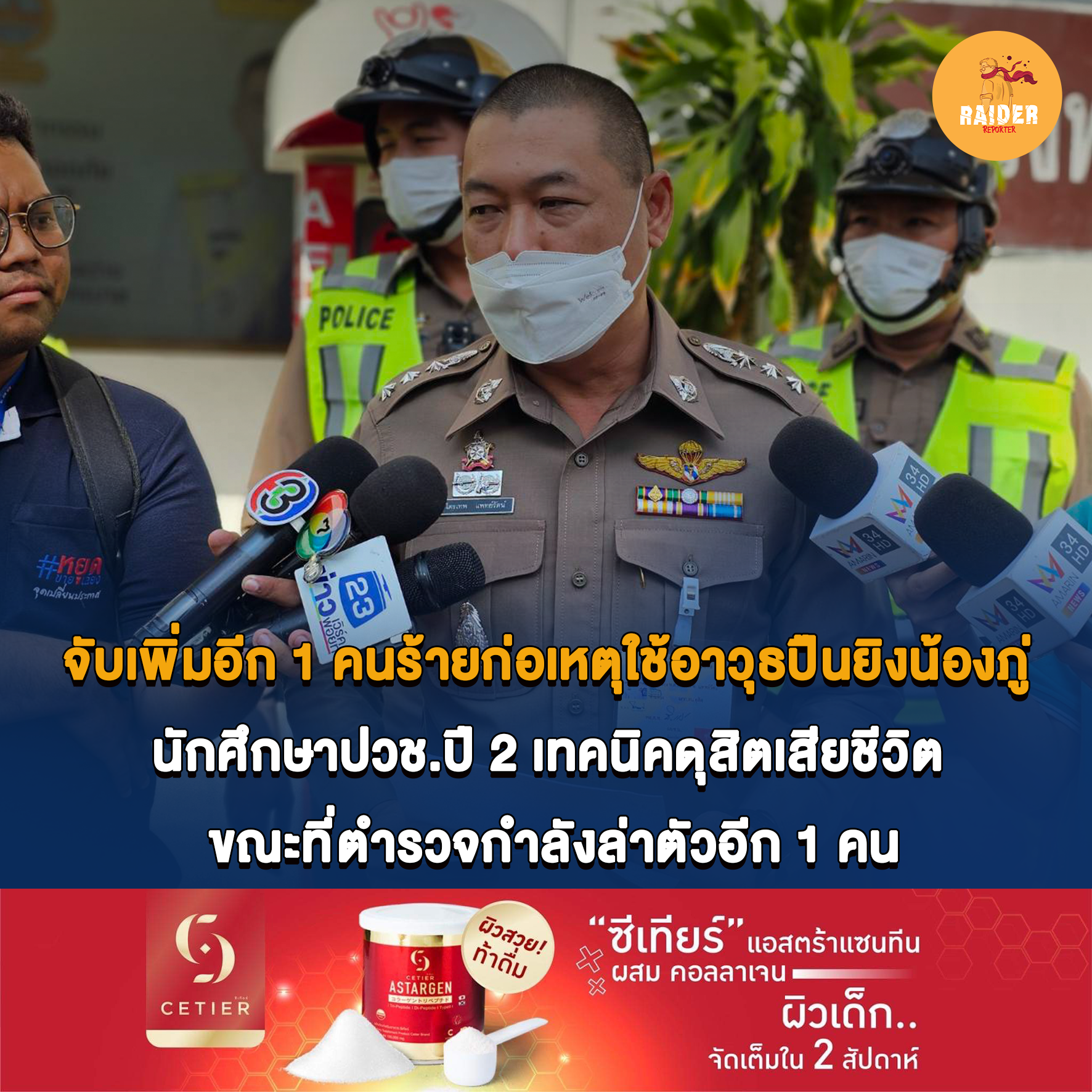 โดยบอกว่าเมื่อวานนี้ ตำรวจชุดสืบชุดสืบสวนนครบาลได้จับนายอัครพล ศิริเมฆานนท์ หรือ ยีนส์ อายุ 22 ปี บุคคลตามหมายจับ ใน 5 ข้อหา คือ ร่วมกันฆ่าผู้อื่น,พยายามฆ่าผู้อืน, มีอาวุธ ปืนและเครื่องกระสุนไว้ในครอบครองโดยไม่ได้รับอนุญาต,พาอาวุธปืน ติดตัวไปในตัวเมือง หมู่บ้านหรือทางสาธารณะโดย ไม่ได้รับอนุญาต,ยิง ปีนซึ่งใช้ดินระเบิดโดยใช่เหตุ ในเมือง หมู่บ้าน หรือที่ชุมชน และพาอาวุธ(อาวุธปืนและมีด)ไปในเมือง หมู่บ้านหรือทางสาธารณะโดยเปิดเผยหรือโดยไม่มีเหตุสมควร / จับได้เมื่อช่วงเย็นวานนี้ ซึ่งนายอัครพล เป็นคนที่ขับรถจักรยานยนต์ยามาฮ่า NMAX สีเทา คันที่ใช่ในการก่อเหตุ