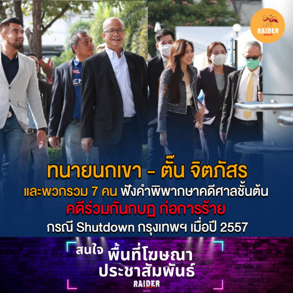 ‘ทนายนกเขา – ตั๊น จิตภัสร์’ และพวกรวม 7 คน ฟังคำพิพากษาคดีศาลชั้นต้น คดีร่วมกันกบฏ ก่อการร้าย กรณี Shutdown กรุงเทพฯ เมื่อปี 2557