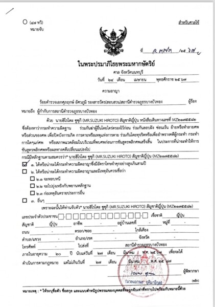 สถานีตำรวจ ภูธรบางบัวทอง ได้ขออำนาจศาล จ.นนทบุรีออกหมายเลขที่ จ.374/2567 เพื่อทำการจับผู้ต้องหาชาวญี่ปุ่นทั้ง 2 ราย ที่ก่อเหตุในครั้งนี้ ในข้อหาร่วมกันฆ่าผู้อื่นโดยไตร่ตรองไว้ก่อน ร่วมกันลอบฝัง ซ่อนเร้น ย้ายหรือทำลายศพหรือส่วนของศพเพื่อปิดบังการเกิด การตาย หรือเหตุแห่งการตาย ร่วมกันโดยทุจริตหรือเพื่ออำพรางคดีผู้กระทำ กระทำการใดๆแก่ศพ หรือสภาพแวดล้อมในบริเวณที่พบศพ ก่อนการชันสูตรพลิกศพเสร็จสิ้น ในประการนี้น่าจะทำให้ การชันสูตรพลิกศพหรือผลทางคดีเปลี่ยนแปลงไป และมีอาวุธปืนและเครื่องกระสุนปืนไว้ในครอบครองโดยไม่ได้รับอนุญาต