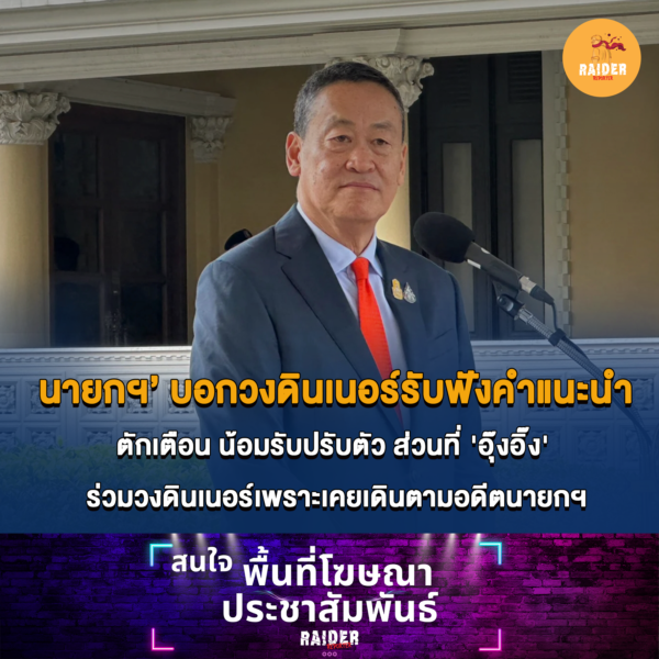 นายกฯ’ บอกวงดินเนอร์ถอดหมวกนายกฯ รับฟังคำแนะนำ-ตักเตือน น้อมรับปรับตัว หลัง ‘ภูมิธรรม’ หยอดนายกฯ พูดตรง ยัน ‘อุ๊งอิ๊ง ’ร่วมวงไม่มีนัย คุ้นเคยทุกคนเคยเดินตามอดีตนายกฯ