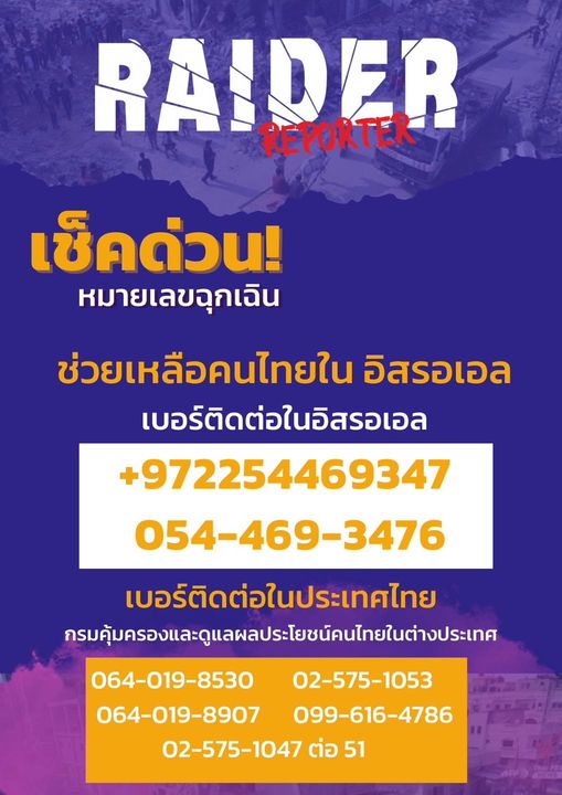 ปฏิบัติตามมาตรการของทางการอิสราเอลอย่างเคร่งครัด และขอให้ทุกคนโดยเฉพาะอย่างยิ่งผู้ที่อาศัยในเขตภาคใต้ใกล้เคียงฉนวนกาซา และภาคกลาง รวมถึงกรุงเทลอาวีฟ ไม่ออกจากที่พักอาศัยสำหรับคนไทยที่ได้รับผลกระทบโปรดติดต่อได้ที่สถานเอกอัครราชทูตฯ หมายเลขโทรศัพท์ (+972) 5 4636 8150 กองคุ้มครองและดูแลผลประโยชน์คนไทยในต่างประเทศ หมายเลข 0 2575 1047-51 ฝ่ายแรงงานไทย ประจำสถานเอกอัครราชทูต ณ กรุงเทลอาวีฟ โทร : +972 544693476 What app ID : 0544693476 Line ID : 0544693476 (ตลอด 24 ชั่วโมง)