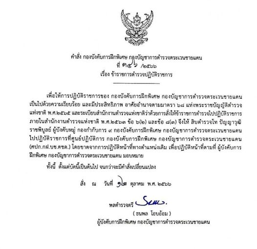 วันที่ 12 ต.ค.66 พล.ต.ต.ธนพล โอบอ้อม ผู้บังคับการฝึกพิเศษ กองบัญชาการตำรวจตระเวนชายแดน มีหนังสือคำสั่ง กองบังคับการฝึกพิเศษ