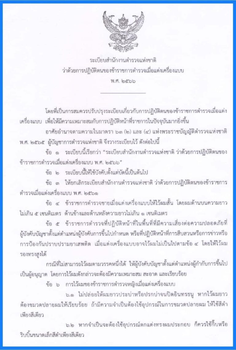 มีใจความระบุว่า ระเบียบนี้เรียกว่า ‘ระเบียบสำนักงานตำรวจแห่งชาติ ว่าด้วยการปฏิบัติตนของข้าราชการตำรวจเมื่อแต่งเครื่องแบบ พ.ศ. 2566’ ระเบียบนี้ให้ใช้บังคับตั้งแต่บัดนี้เป็นต้นไป และให้ยกเลิกระเบียบสำนักงานตำรวจแห่งชาติ ว่าด้วยการปฏิบัติตนของข้าราชการตำรวจเมื่อแต่งเครื่องแบบ พ.ศ. 2561