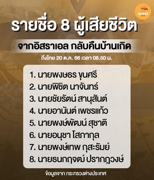 กระทรวงการต่างประเทศ แจ้งว่า สถานทูตจะนำส่งร่างของคนไทย ที่เสียชีวิตจากเหตุสงครามอิสราเอล จำนวน 8 ราย เดินทางกลับประเทศไทยเป็นชุดแรก ด้วยสายการบิน El